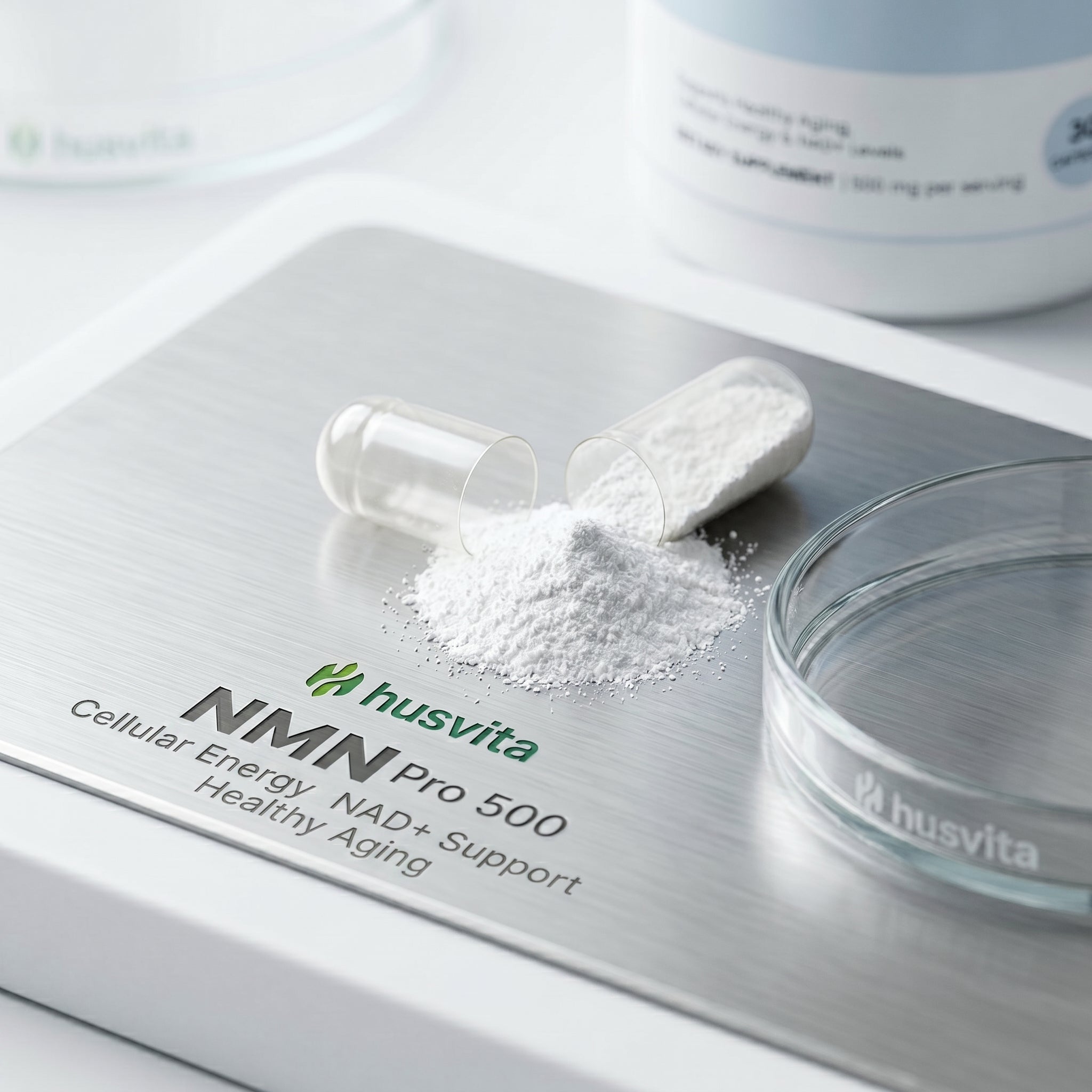 500 mg of ß-Nicotinamide Mononucleotide, a compound that plays a key role in the body’s natural production of NAD+ (nicotinamide adenine dinucleotide).
