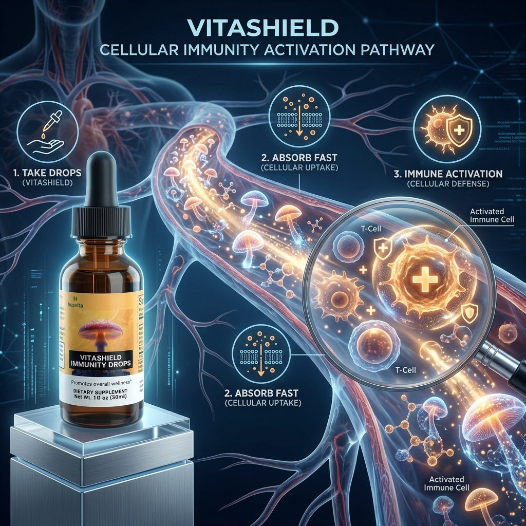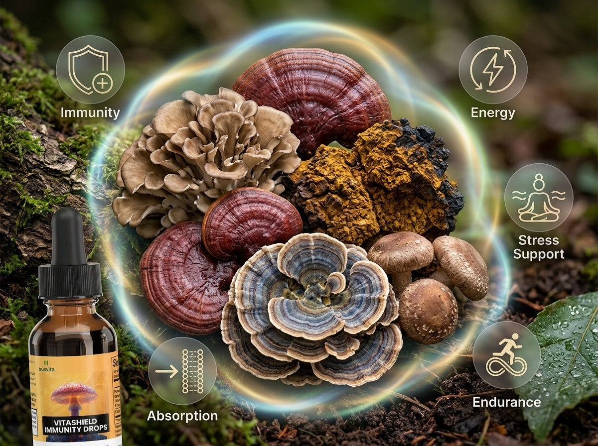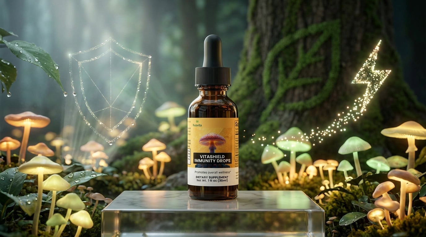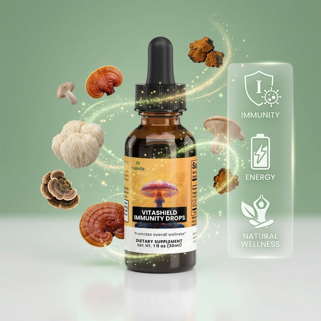 Husvita VitaShield Immunity Drops deliver a blend of functional mushrooms traditionally valued for their role in supporting wellness and vitality. The proprietary mushroom immune complex features chaga, reishi, maitake, shiitake, and turkey tail — mushrooms recognized in traditional practices for helping support the body’s natural immune defenses. Combined with cordyceps mushroom extract, this carefully crafted formula is designed to complement a balanced lifestyle focused on resilience and everyday well-being.