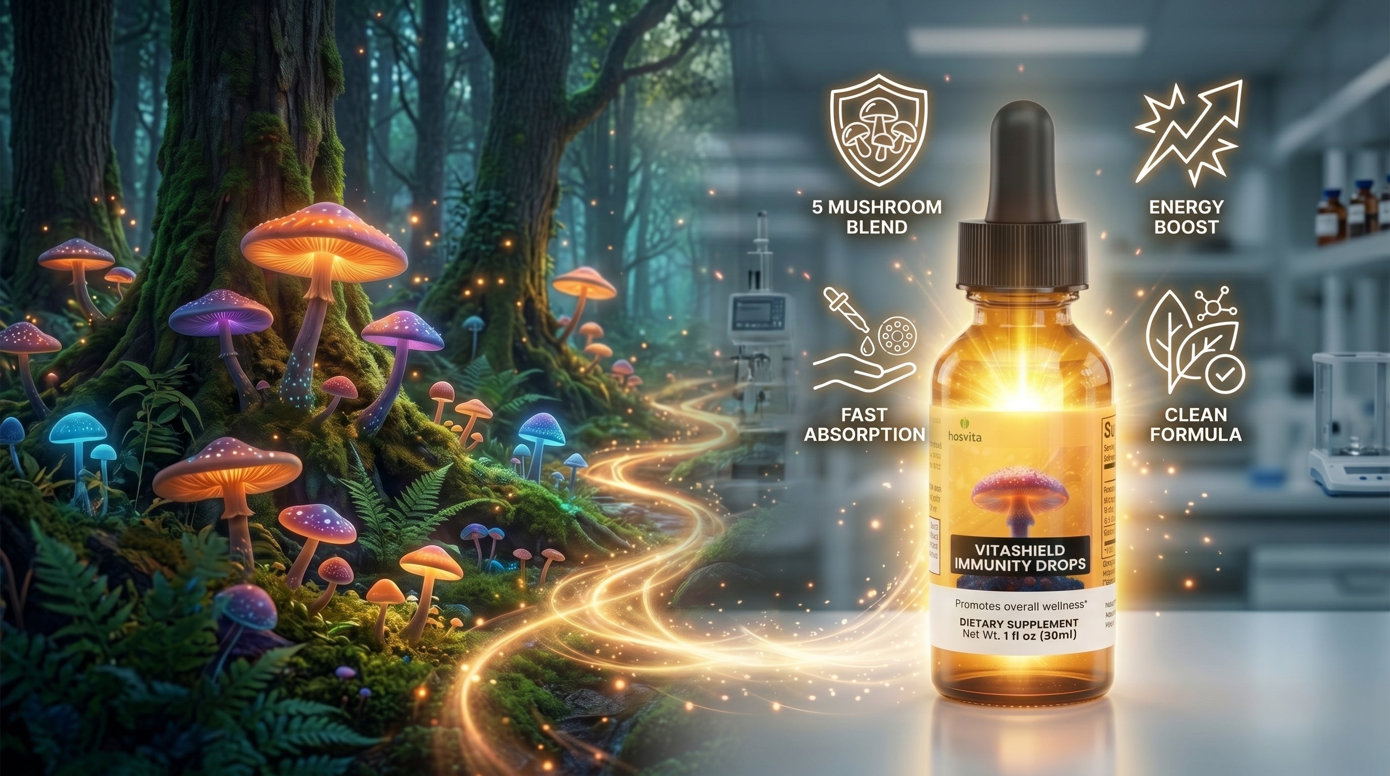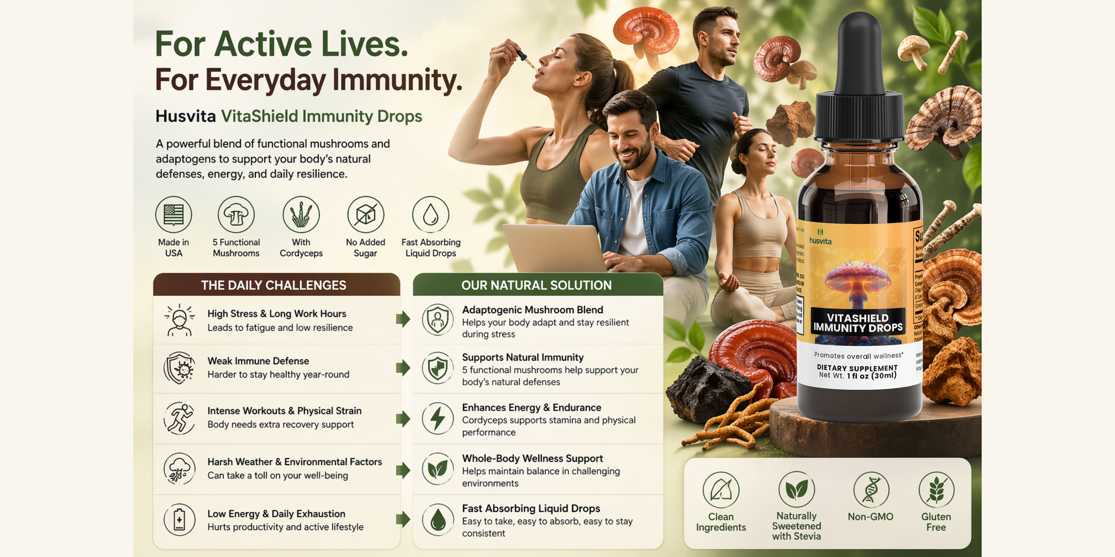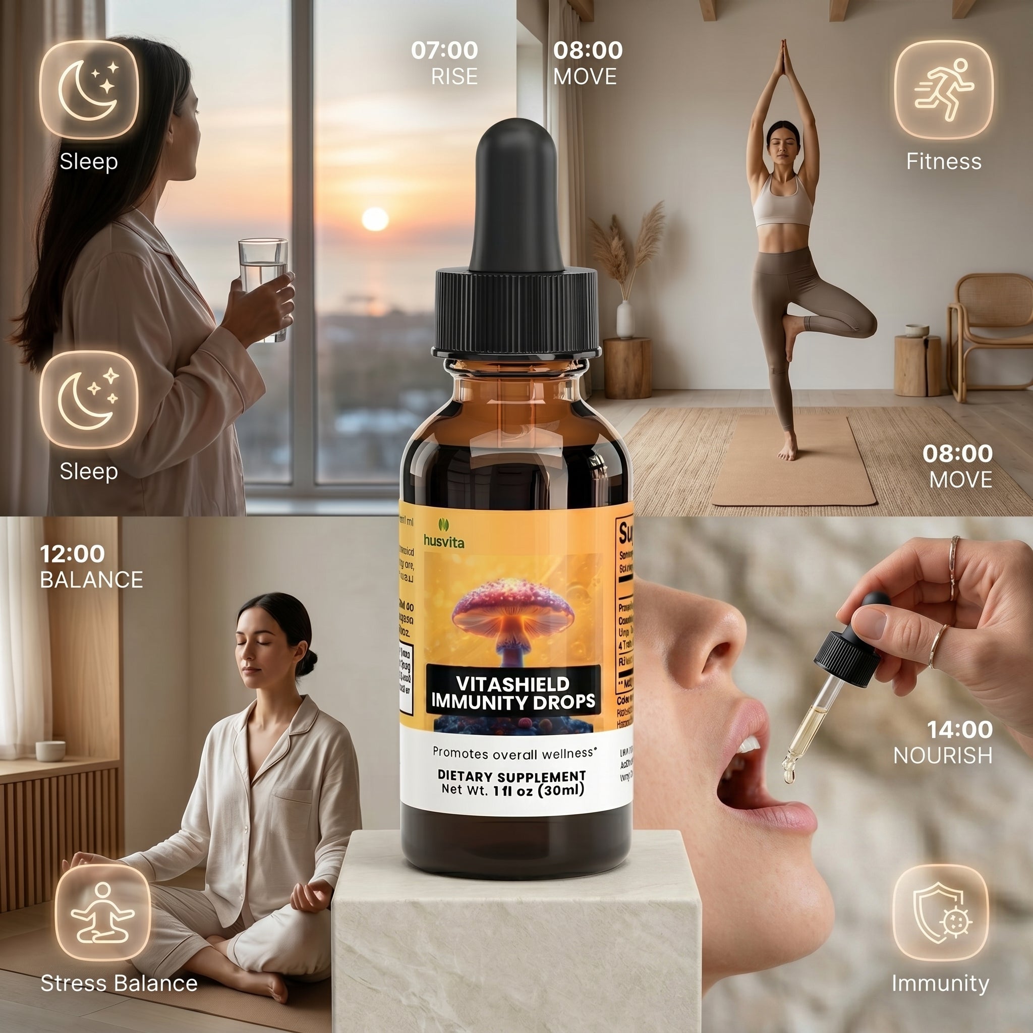 Husvita VitaShield Immunity Drops deliver a blend of functional mushrooms traditionally valued for their role in supporting wellness and vitality. The proprietary mushroom immune complex features chaga, reishi, maitake, shiitake, and turkey tail — mushrooms recognized in traditional practices for helping support the body’s natural immune defenses. Combined with cordyceps mushroom extract, this carefully crafted formula is designed to complement a balanced lifestyle focused on resilience and everyday well-being.